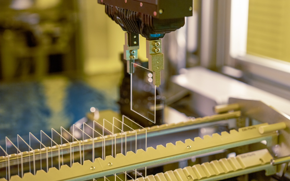 Blick in die Produktion (Reinraum). SCHOTT ist das erste Unternehmen, das den komplexen End-to-End-Prozess vom Glas bis zum Wellenleiter abdeckt.