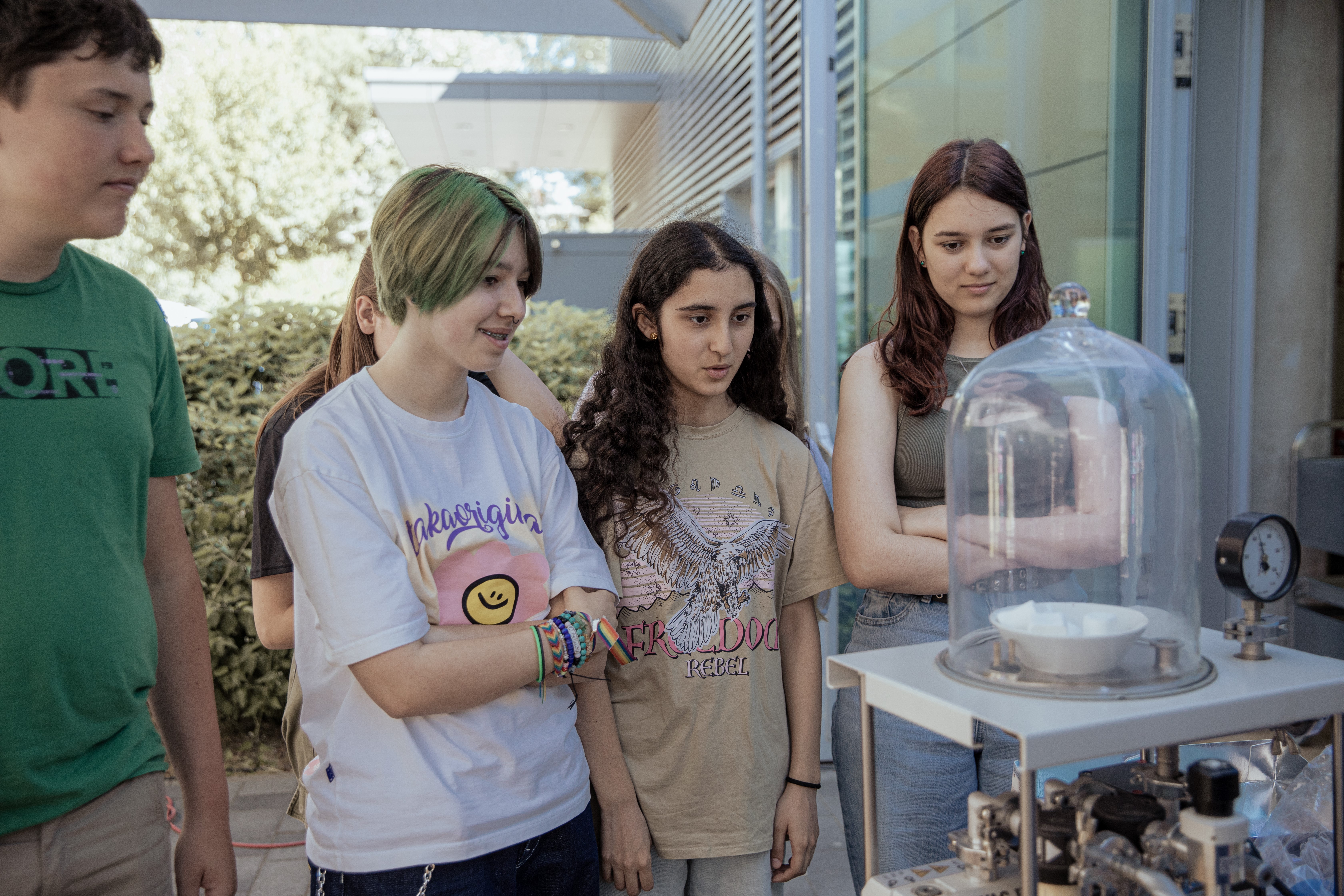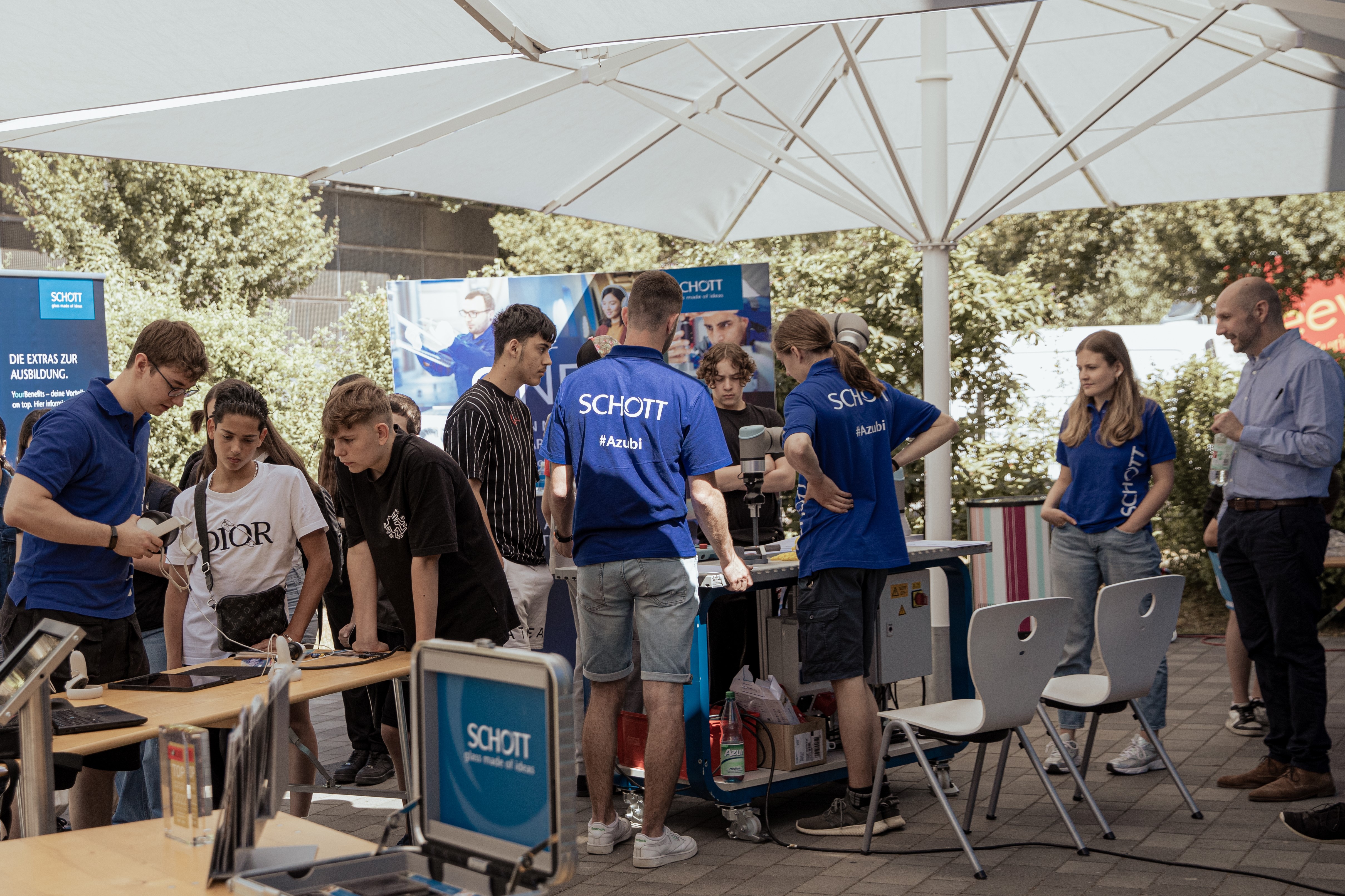 Schüler stehen an einem Tisch unter einem Sonnenschirm und SCHOTT Auszubildende erklären ihnen etwas.