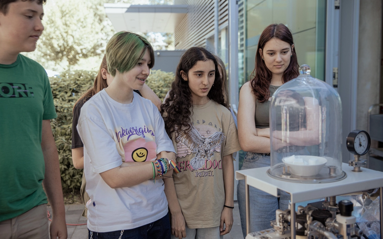 Schüler in Mainz stehen um einen Tisch während ein SCHOTT Azubi ihnen etwas demonstriert