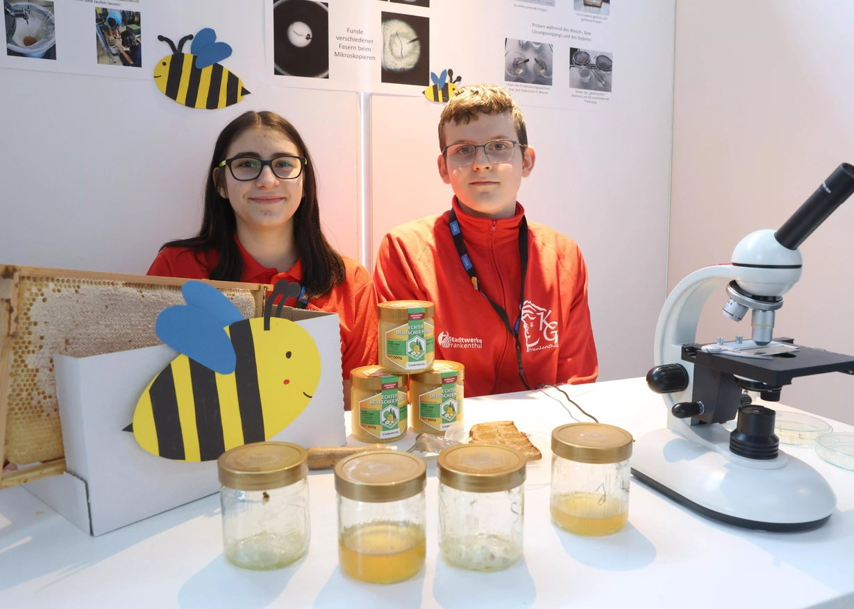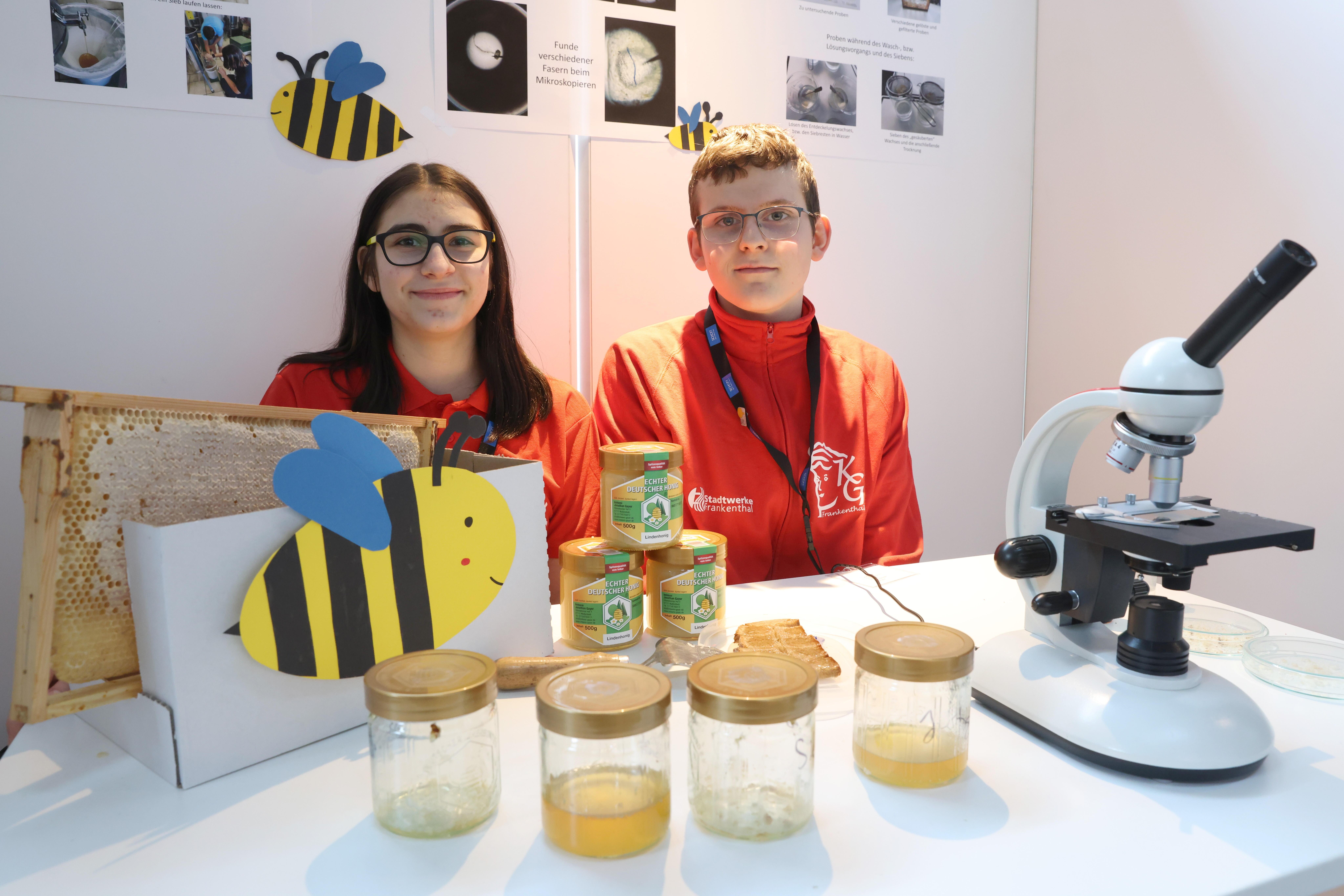 Sarah Bader und Philipp Memmer vom Karolinen-Gymnasium Frankenthal siegten mit dem Thema „Plastik auf dem Honigbrot?“ im Fach Geo- und Raumwissenschaften bei „Jugend forscht“. Foto: SCHOTT