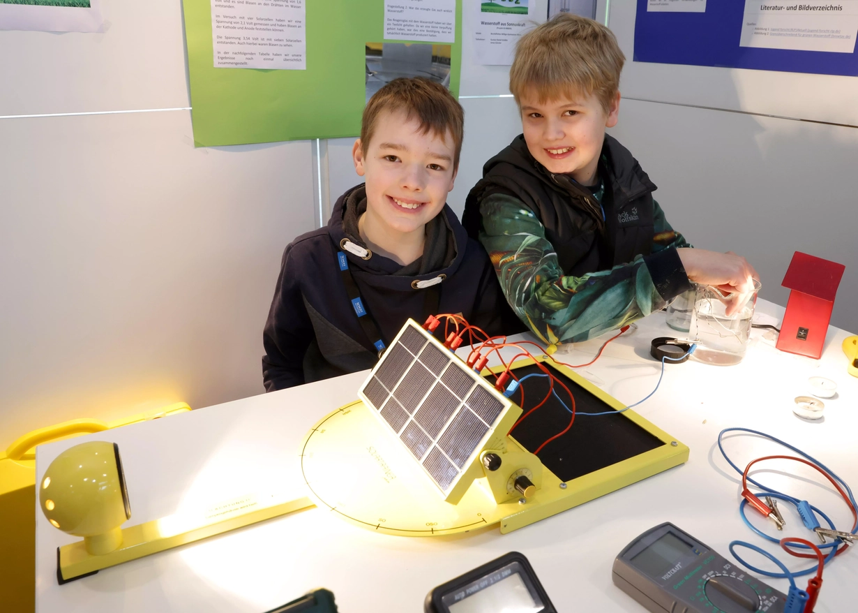 Jonas Günzler und Gustav Schäfer vom Bischöflichen Willigis-Gymnasium Mainz siegten mit dem Thema „Wasserstoff aus Sonnenkraft“ im Fach Physik bei „Schüler experimentieren“. Foto: SCHOTT