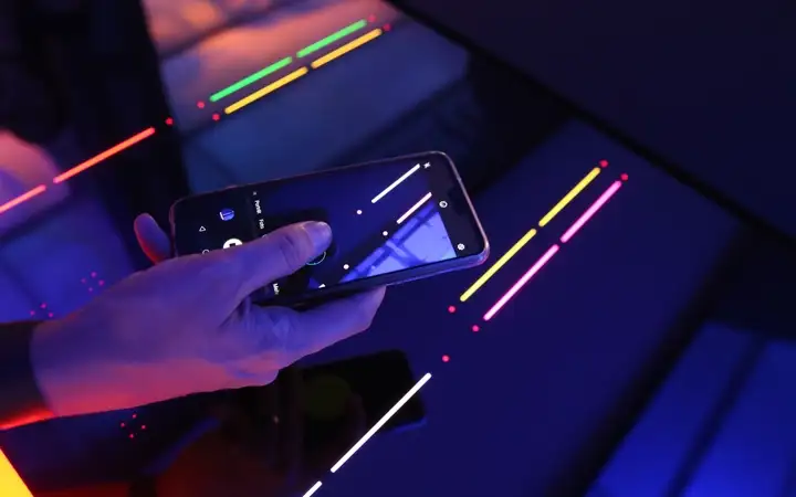 Hand holding a smartphone over a SCHOTT CERAN EXCITE® cooktop with colored lighting