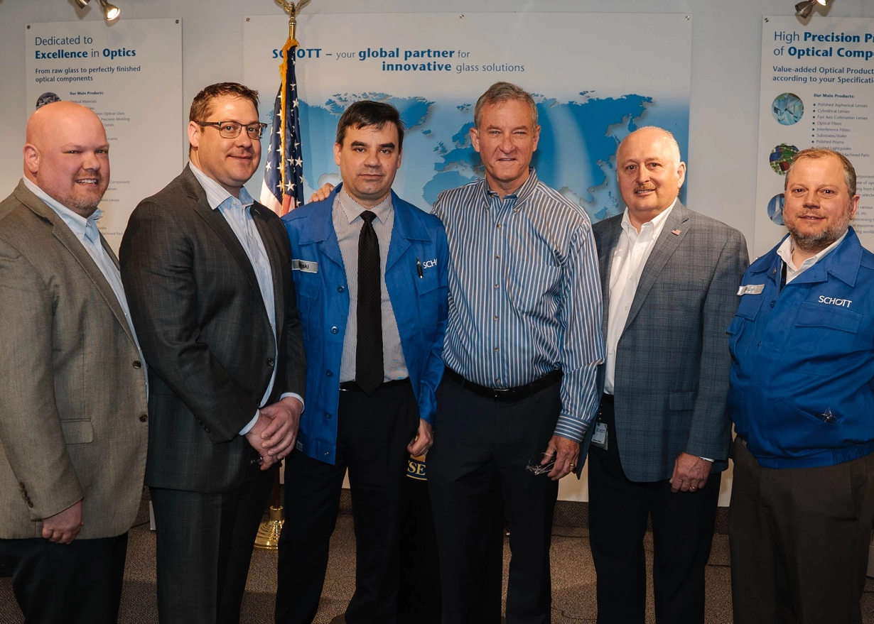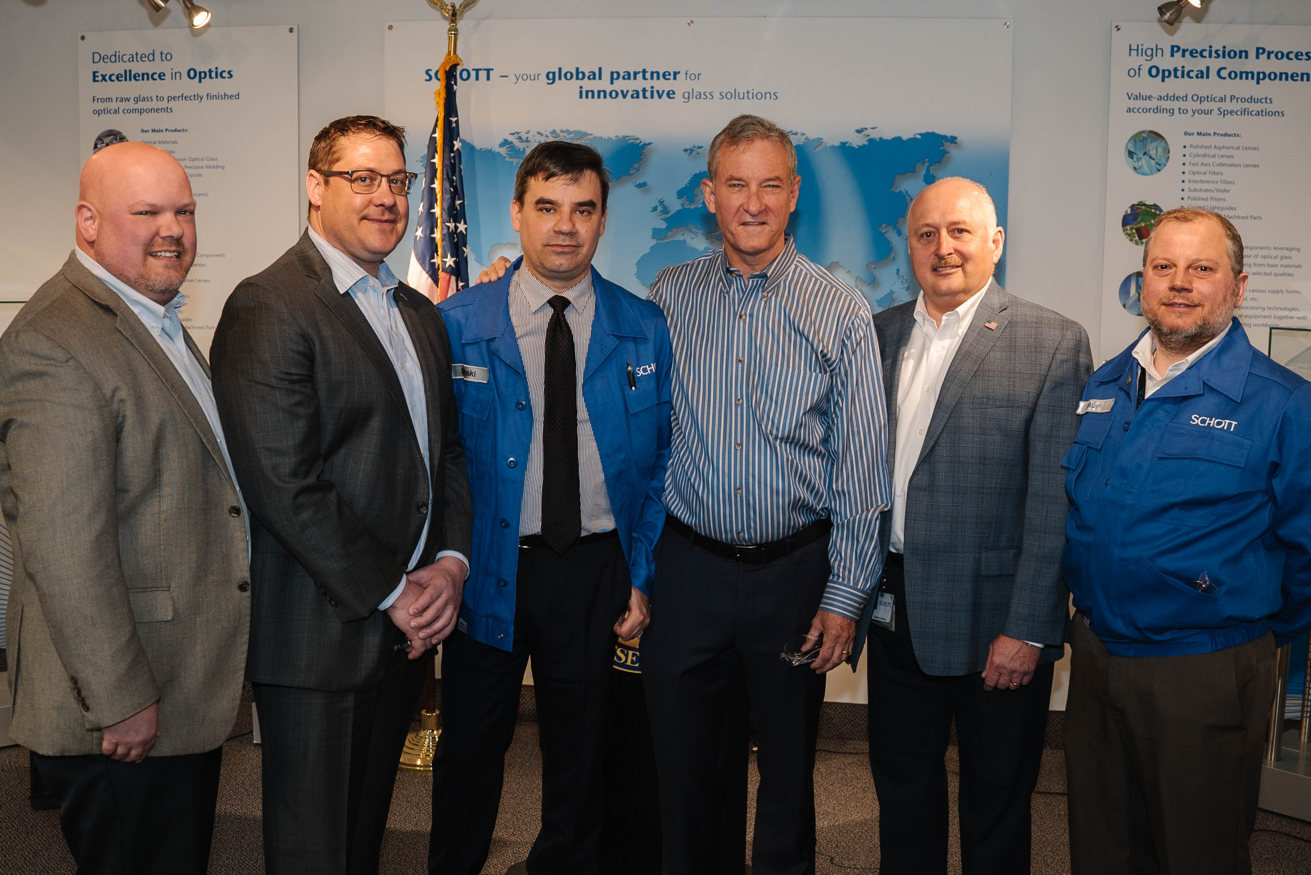 Group photo (FLTR): Bill James (Head of R&D and New Ventures, SCHOTT North America), Tim Eagleson (Head of Defense Sales and Marketing, SCHOTT North America), Vincent Rovinski (Duryea Site Manager, SCHOTT North America), U.S. Representative Matt Cartwright (PA-08), Stephen Sokach (Director Sales, SCHOTT North America), Dave Alunni (Director of Development and Applications, SCHOTT North America) (Credit: SCHOTT).