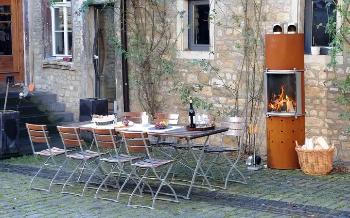 Garden and chairs next to a wood-burning outdoor fire with a SCHOTT ROBAX® fire viewing panel