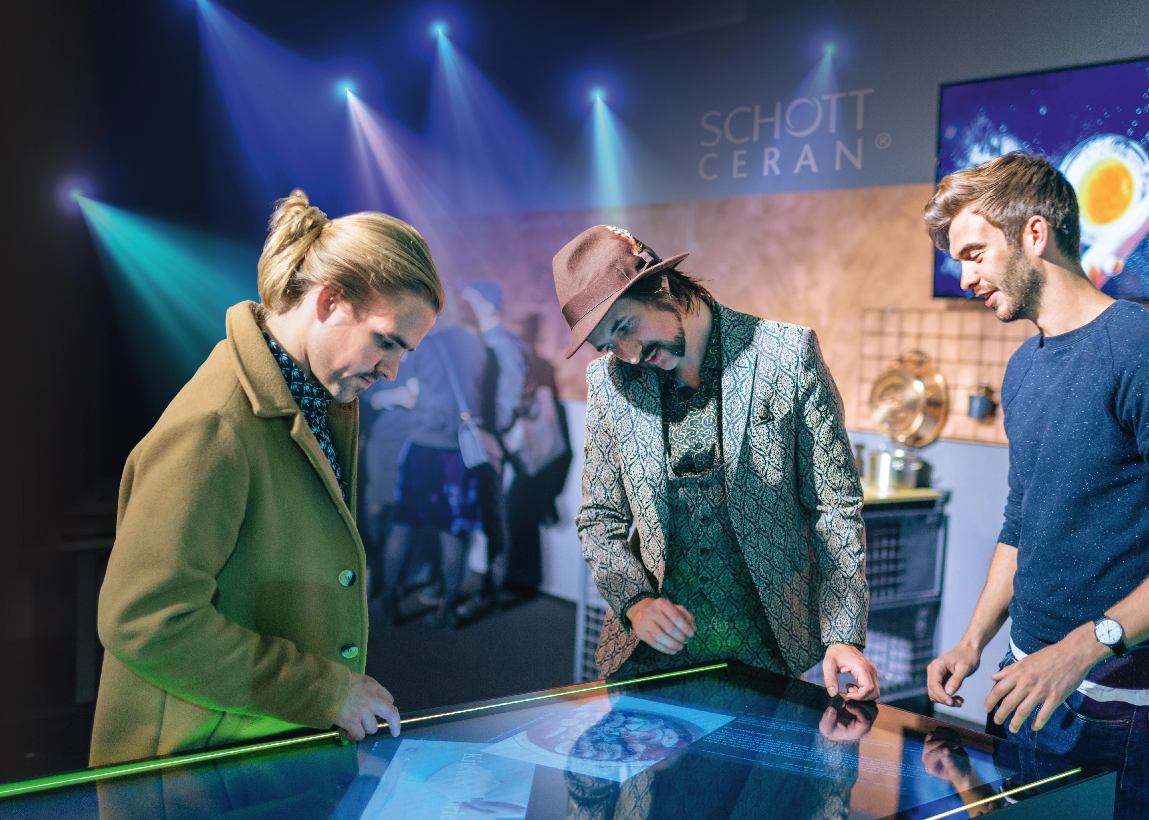 Group of young people looking at a SCHOTT CERAN EXCITE® glass-ceramic cooktop panel at an exhibition