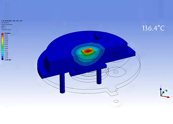 CRS1010管座+CRS1010热沉, 最大温度为128.3˚C 。
