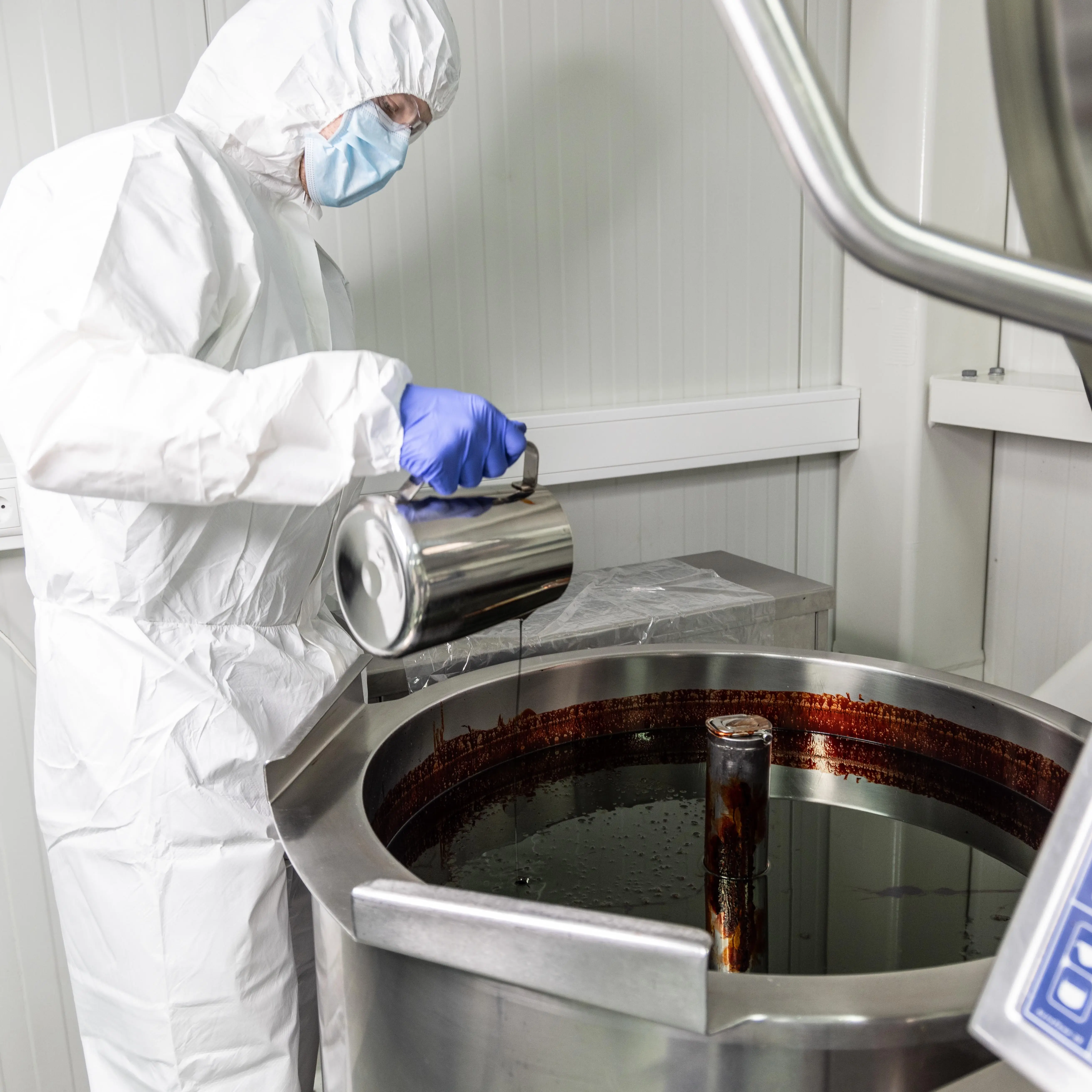 玻璃管中的翠绿色变成了深棕红色,预示着收获即将到来。虾青素从生物质中提取出来,以葵花籽油为基油,进一步加工成油树脂溶剂。尽管生产过程繁琐,但这种溶剂能有效缓解人们的压力,起到抗氧化、促进新陈代谢平衡的作用。